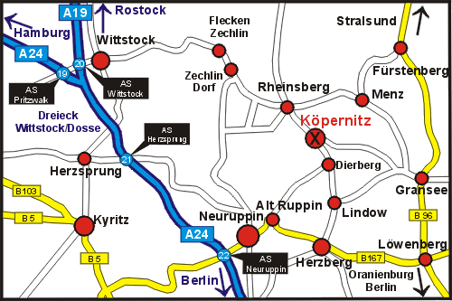 A 24 in Richtung Hamburg bis Abfahrt Neuruppin, dann nach Altruppin und in